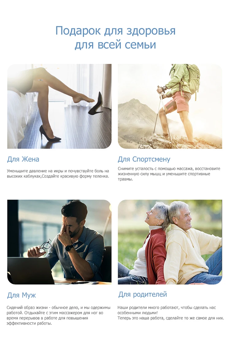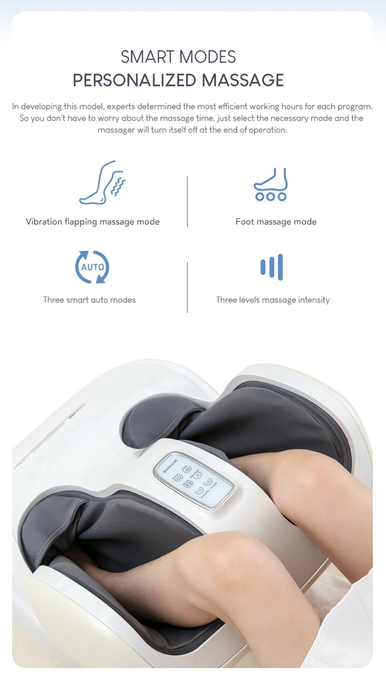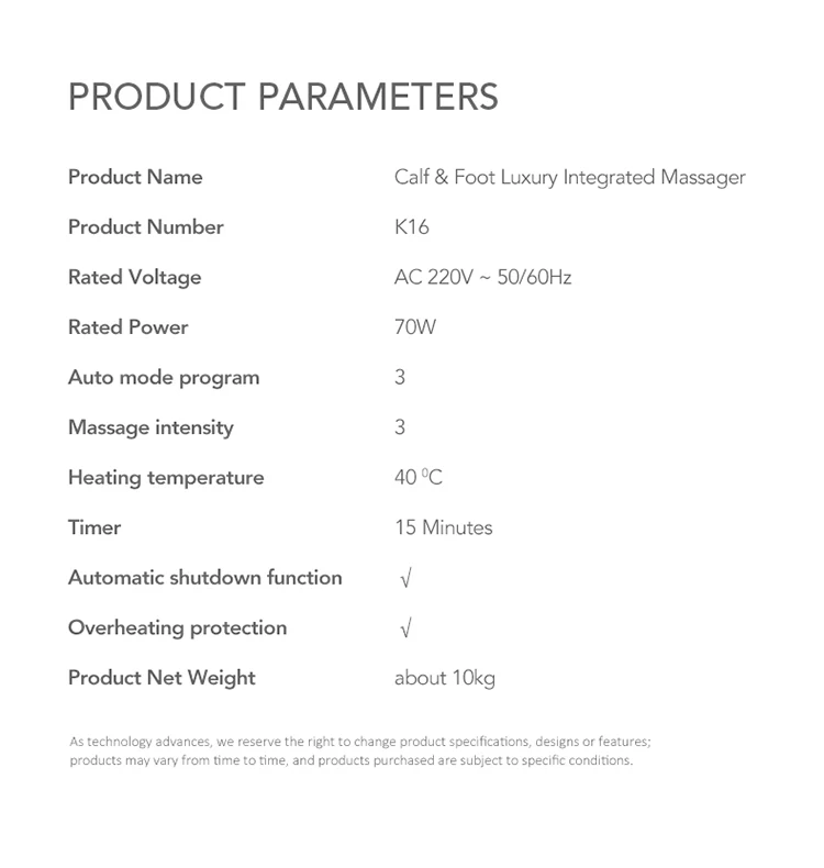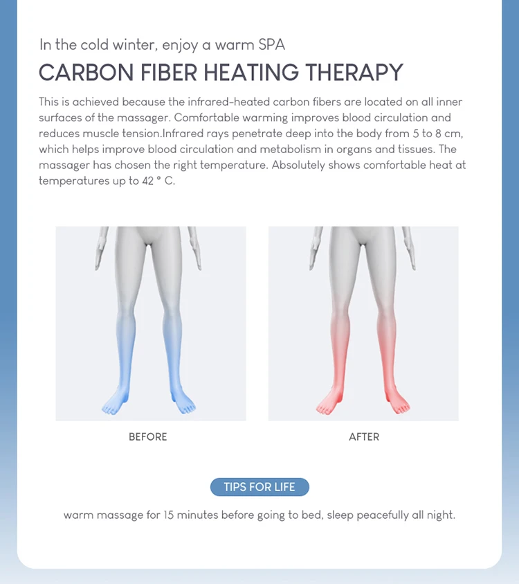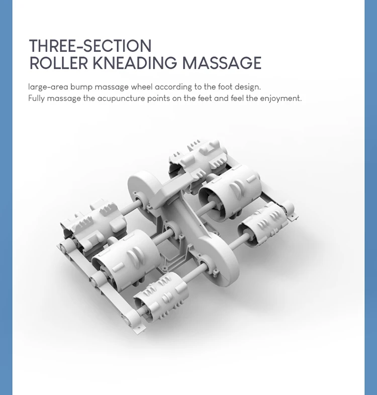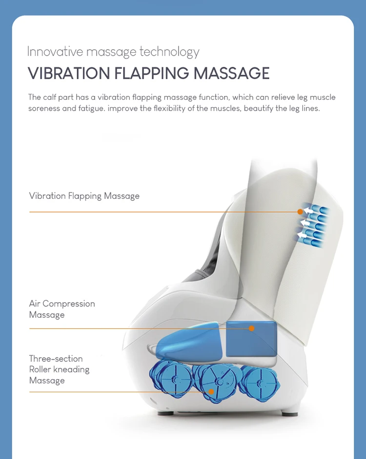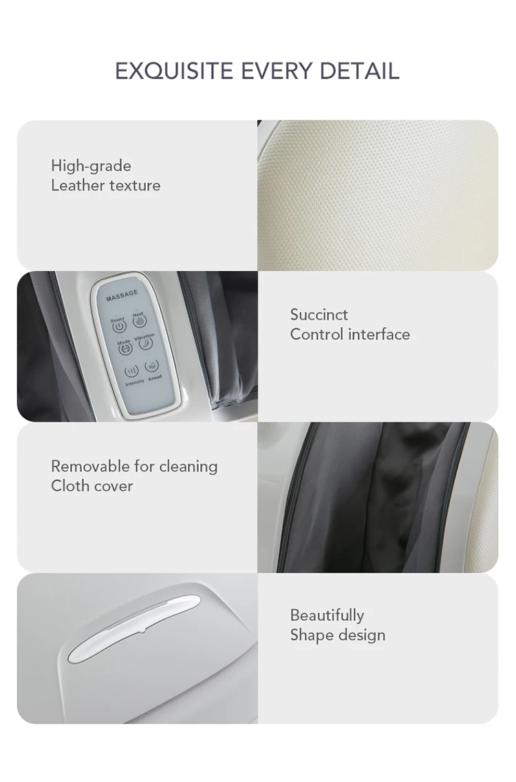 Use multiple modes and multiple massage techniques to reduce muscle fatigue, improve muscle flexibility, beautify leg lines, promote blood circulation, relieve exercise after tight pain, and stimulate key acupuncture points, Improve overall physical and mental health, soothe the nervous system, relieve fatigue, and improve sleep.