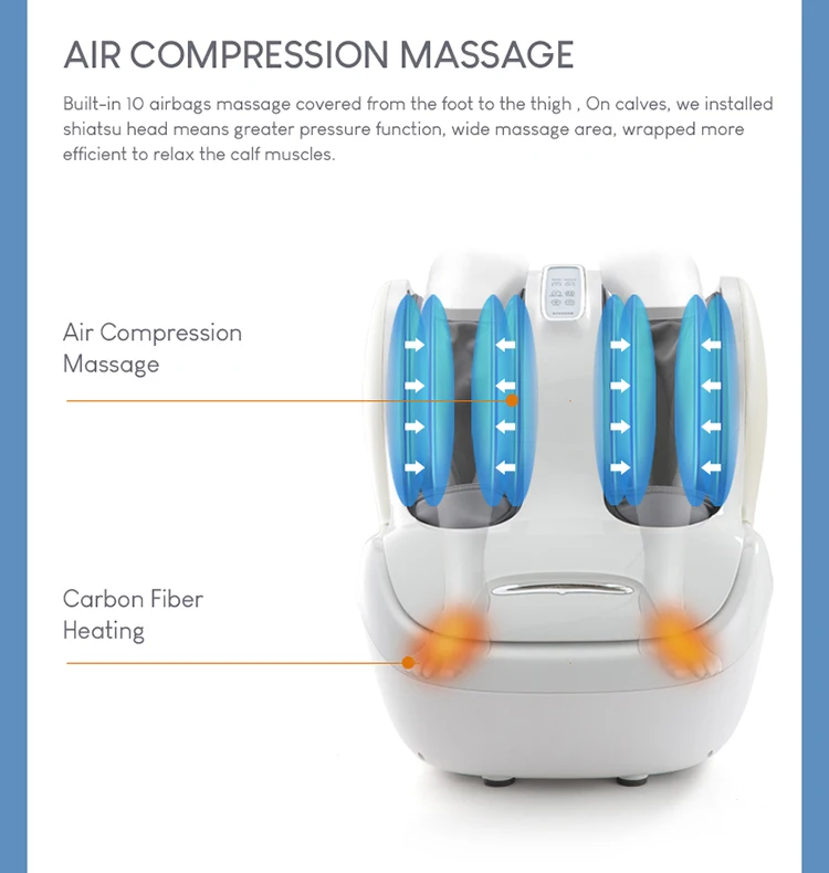 Built-in 10 airbags massage covered from the foot to the thigh , On calves, we installed shiatsu head means greater pressure function, wide massage area, wrapped more efficient to relax the leg muscles.