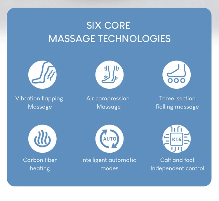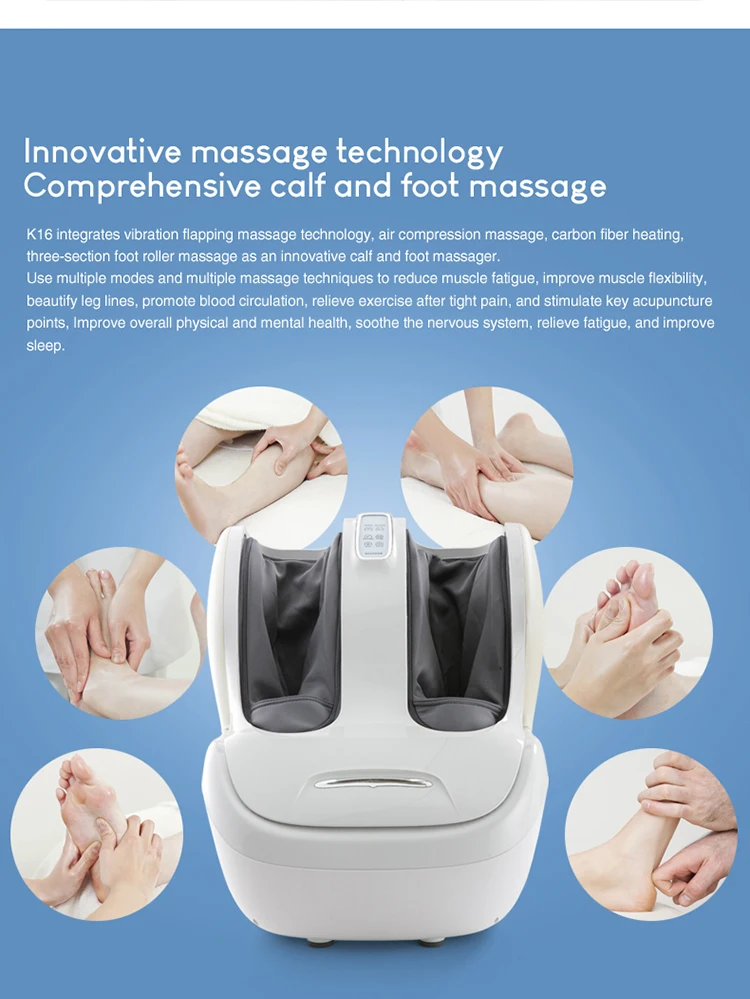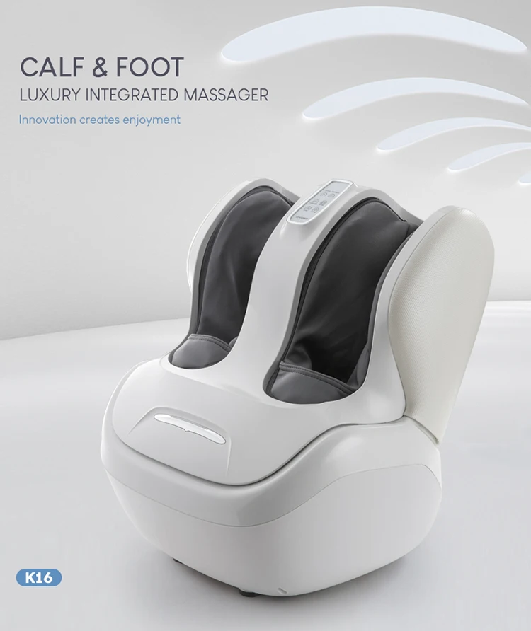 K16 integrates vibration flapping massage technology, air compression massage, carbon fiber heating, three-section foot roller massage as an innovative calf and foot massager.